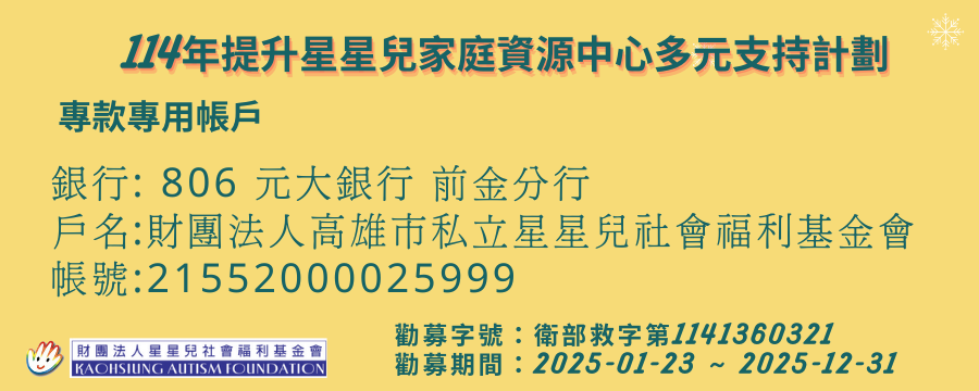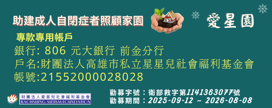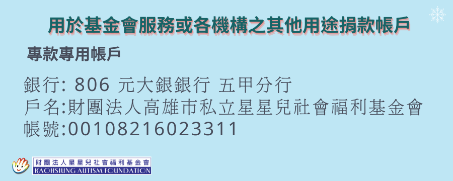 帳 號: 42067539 戶 名: 財團法人高雄市私立星星兒社會福利基金會